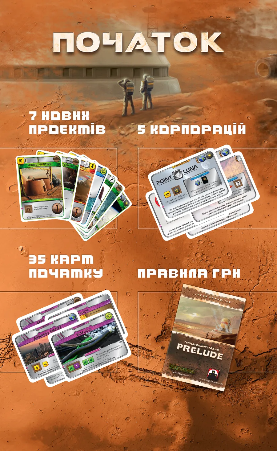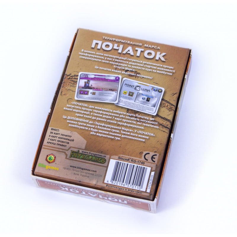 Внимание!!! Гра «Тераформування Марса: Початок»(Покорение Марса: Пролог) не є самостійною грою – це доповнення! Для гри в неї вам знадобиться базова настільна гра.Тераформування Марса».