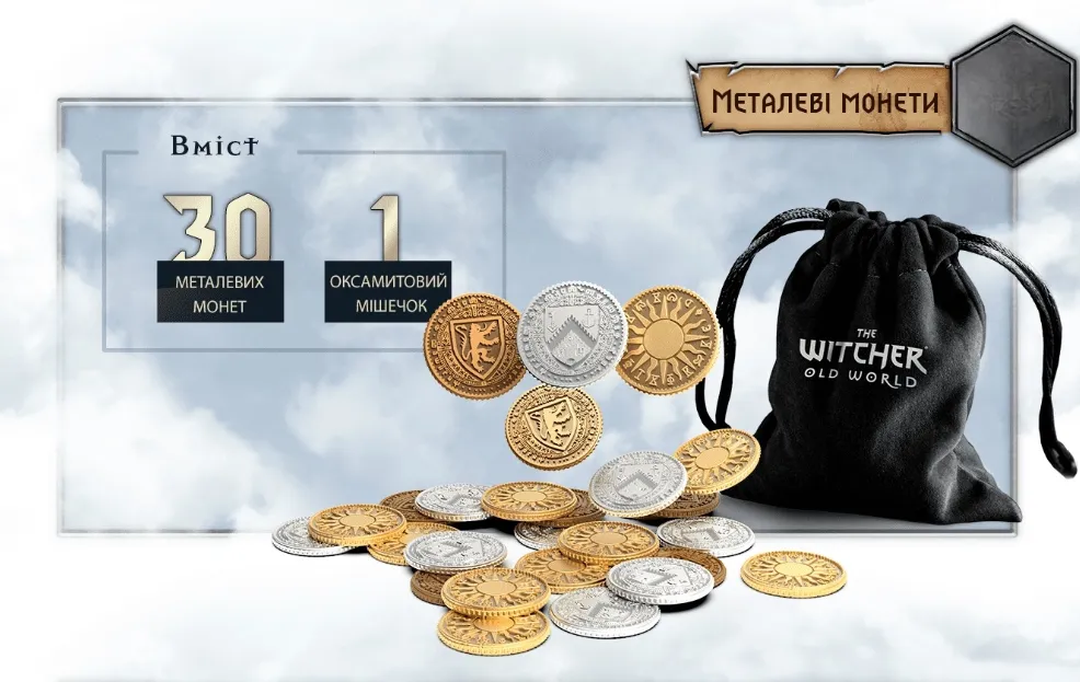 Шикарні металеві монети для настільної гри «Відьмак. Старий світ». У комплекті 30 красивих монет трьох видів та оксамитовий мішечок.
